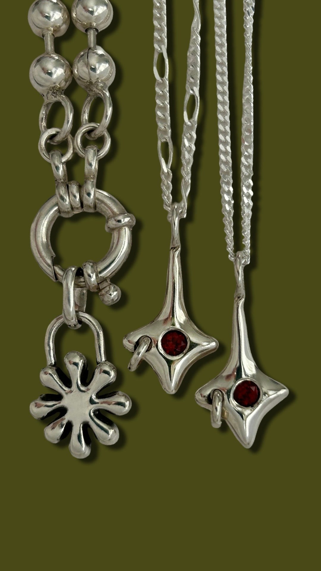 strange gossip is not quite like strange news. this design is a smaller variation of my original star charm, strange news. this lil sterling silver charm is flush set with a juicy red garnet and then pierced with a sterling silver hoop.